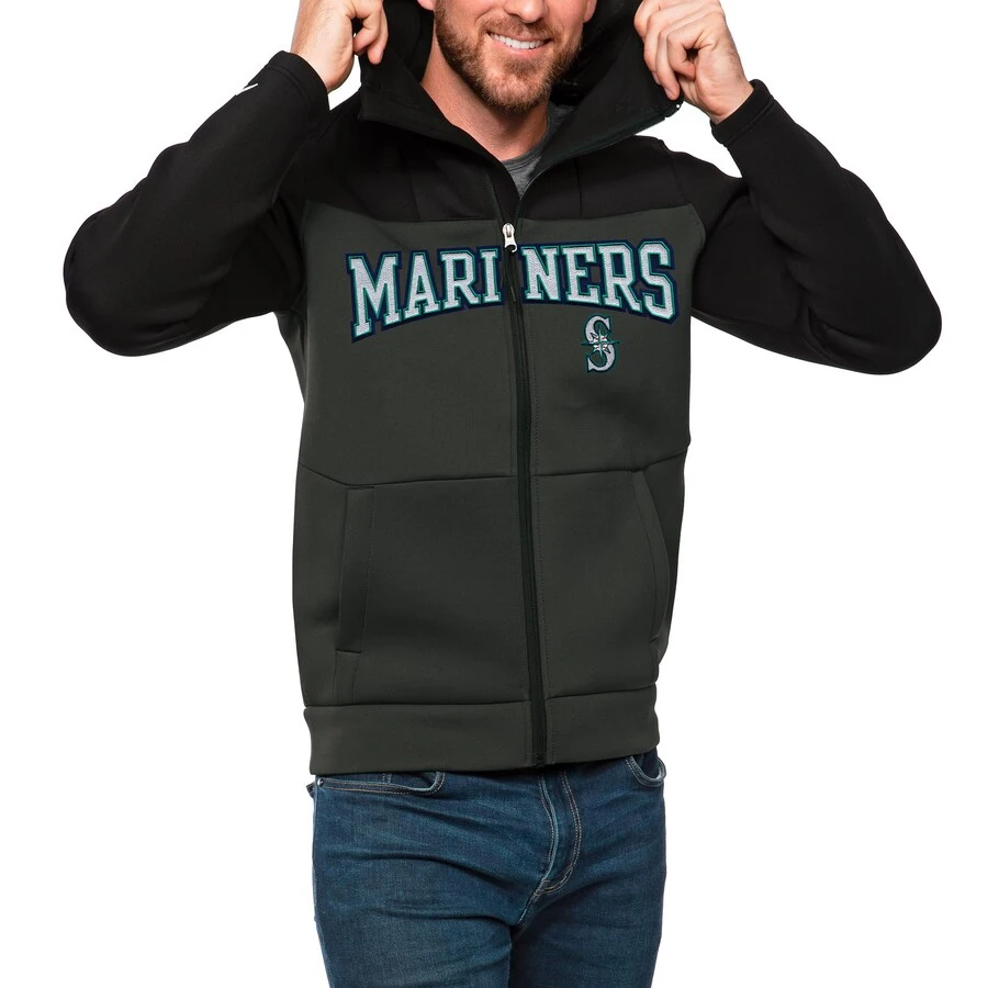 Men’s Seattle Mariners Antigua Black/Charcoal Wordmark Protect Full-Zip Hoodie