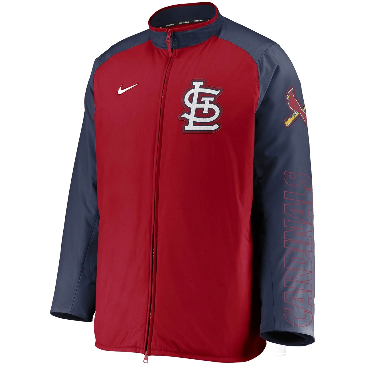 Maintain your status as the ultimate St. Louis Cardinals fan through the winter months with this Authentic Collection Dugout full-zip jacket from Nike. The elastic cords at the waist and cuffs keep warmth inside so that you can maintain your comfort, and the stellar St. Louis Cardinals-inspired design on the exterior is just what you need to proclaim your allegiance to your squad.